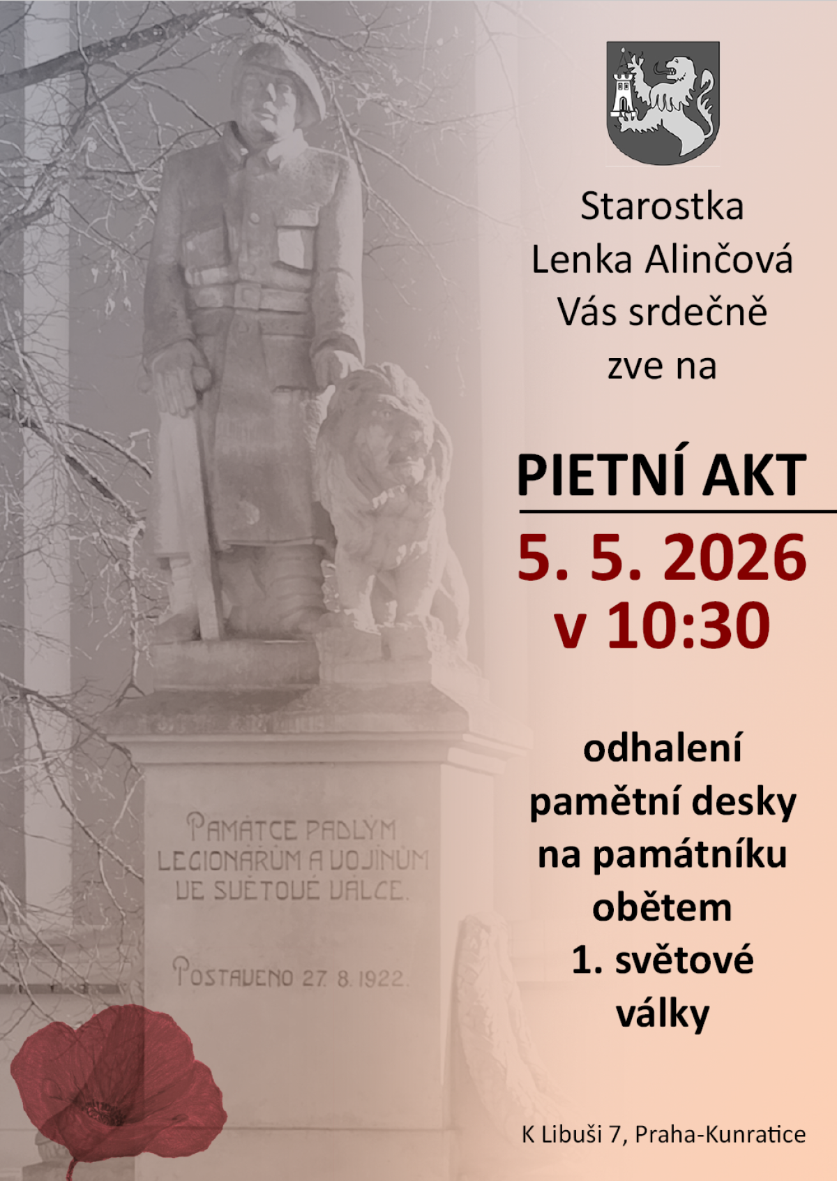 Dovolujeme si Vás pozvat na slavnostní odhalení desky kunratických legionářů. Pomník obětem 1. světové války K Libuši 7., Praha 4 – Kunratice